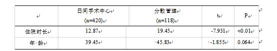 表1 日間手術(shù)中心及分散管理日間患者相關(guān)信息對比