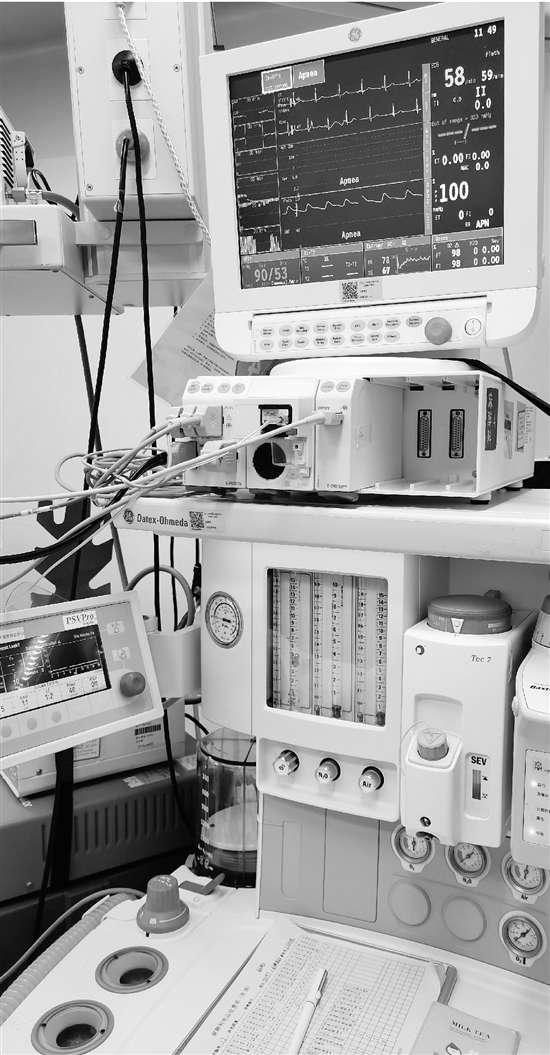 實(shí)施麻醉為什么需要這么多裝備?“因?yàn)槁樽頃?huì)抑制呼吸,讓人缺氧。我們?cè)诼樽淼耐瑫r(shí)會(huì)給患者吸氧,多數(shù)全麻,還需要給患者氣管插管,人工呼吸,就是為了避免意外。麻醉會(huì)讓人嘔吐,失去意識(shí)后,嘔吐可能會(huì)堵塞氣道!敝艽蟠赫f(shuō),“如果沒(méi)有這些設(shè)備,我也不敢給人實(shí)施麻醉!