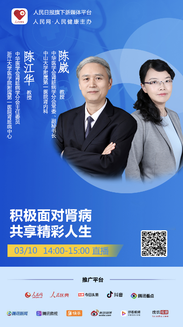 為提高大眾對慢性腎臟病早查、早防、早治的認知,國際腎臟病學會和國際腎臟基金聯(lián)盟聯(lián)合提議,自2006年起將每年3月第二個星期四定為世界腎臟日。今年腎臟日的主題為“積極面對腎病,共享精彩人生”,3月11日,中華醫(yī)學會腎臟病學分會主任委員、浙江大學醫(yī)學院附屬第一醫(yī)院腎臟病中心陳江華,中華醫(yī)學會腎臟病學分會常委、副秘書長、中山大學附屬第一醫(yī)院腎內(nèi)科陳崴做客人民網(wǎng)·人民好醫(yī)生訪談間,普及慢性腎臟病相關知識。陳江華在訪談中強調(diào),目前全世界有8.5億人因各種原因患有慢性腎臟病,我國慢性腎臟病患者超過1億,呈現(xiàn)患病率高、危害大、知曉率低的特點。慢性腎臟病是威脅我國人民群眾生命健康的“沉默殺手”,倡導健康生活方式,是預防慢性腎臟病的關鍵。