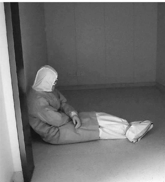 ▲抗疫期間,結(jié)束工作的浙大一院急診科副主任李彤靠著ICU墻根睡著了。