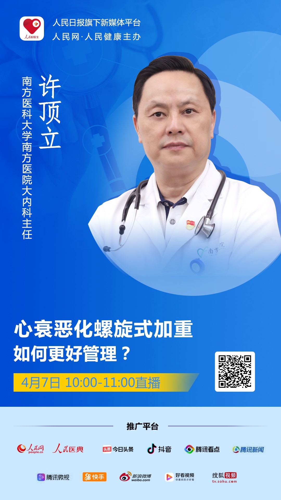 2021年4月7日(周三)10:00-11:00,南方醫(yī)科大學(xué)南方醫(yī)院大內(nèi)科主任許頂立做客人民日報社旗下新媒體“人民好醫(yī)生”客戶端,為大眾答疑解惑。