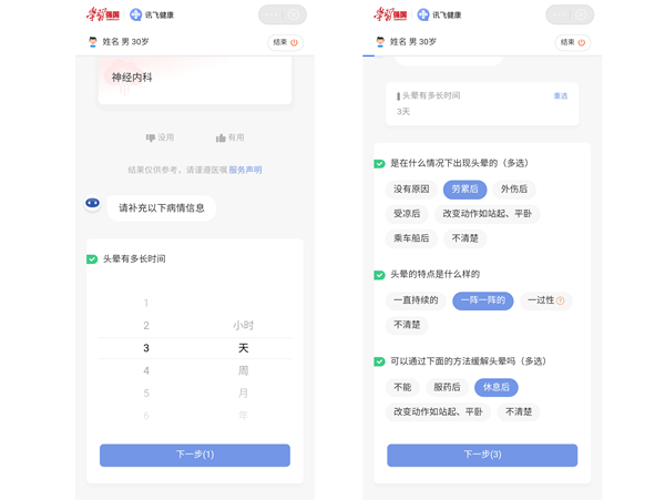 “訊飛健康”是由科大訊飛聯(lián)合“學(xué)習(xí)強(qiáng)國”學(xué)習(xí)平臺共同推出,利用語音交互、自然語言理解、醫(yī)學(xué)認(rèn)知智能與推理技術(shù)等,實(shí)現(xiàn)智能導(dǎo)診、疾病自查等功能的智能服務(wù)助理。用戶進(jìn)入智能導(dǎo)診頁面后,可以將病癥情況以文字或語音的形式描述出來。系統(tǒng)基于醫(yī)療問診數(shù)據(jù),詢問用戶分診癥狀的詳細(xì)誘因、癥狀性質(zhì)等信息,生成結(jié)構(gòu)化病歷。