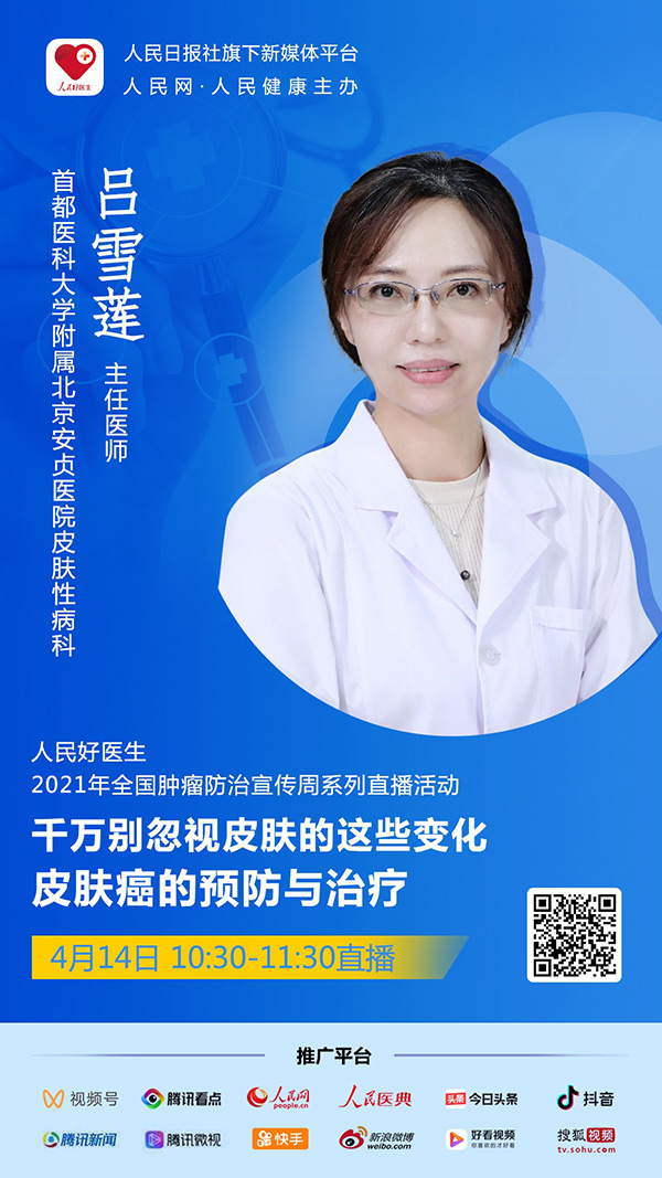 2021年4月14日(周三)10:30-11:30,首都醫(yī)科大學(xué)附屬北京安貞醫(yī)院皮膚性病科主任醫(yī)師呂雪蓮 做客人民日?qǐng)?bào)社旗下新媒體“人民好醫(yī)生”客戶端,為大眾答疑解惑。