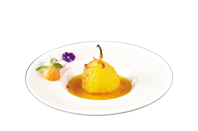 朱雪敏稱,荼薇可以做成凍干露、氣泡水、做成醬、酒等等。相比起普通的玫瑰花,它的香氣是濃郁張揚(yáng)而奔放,能一把將人的嗅覺抓住,令人難忘。粵菜師傅馬如鑒用這荼薇烹制了一道山楂荼薇雪梨和一道荼薇酒火焰羅氏蝦。前者,是用荼薇花醬和荼薇花酒調(diào)和成冷湯底,將雪梨浸泡其中,待幾日之后,風(fēng)味滲透入雪梨內(nèi),方可作為一道山楂荼薇雪梨甜品;后者,通過明火炙烤將特有的清新飄逸的荼薇花芬芳與醬汁濃郁的羅氏蝦融合在一起,達(dá)到鮮香美味的口感,色香味俱全。