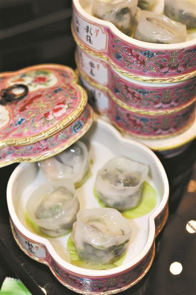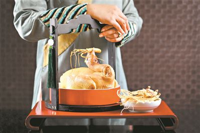馬師傅用小小人參烹制多道佳肴:水晶雞、燉湯、人參菠菜餃……人參水晶雞是甄選肉質(zhì)鮮美的清遠(yuǎn)雞及長白山5年干人參,采用廣式傳統(tǒng)清蒸手法,使得人參的獨(dú)特香氣完全地滲入腌制過的肉質(zhì)中,皮爽肉滑鮮味濃,保留了雞肉原汁原味、外皮彈的特點(diǎn)。人參菠菜餃以瘦豬肉為主料,豬肉有滋陰潤燥、益氣生津的功效,搭配富含鐵元素的菠菜和長白山3年鮮人參打成的人參粉,別有一番滋味。人參燉水魚湯,則用大連鮑魚、水魚、新鮮人參和老雞足足燉上4個(gè)小時(shí),味道融合恰到好處,一分不多半分不少,讓人甚為舒坦,不燥不過。朱雪敏認(rèn)為此湯尤其適合這個(gè)季節(jié)飲用。