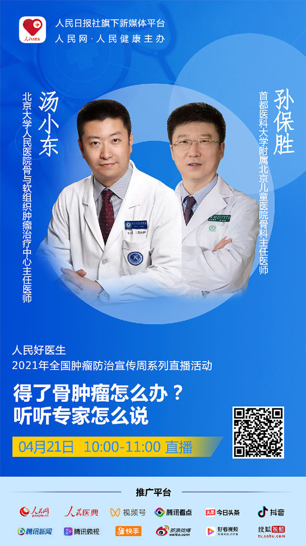 2021年4月21日10:00-11:00我們有幸邀請(qǐng)到北京大學(xué)人民醫(yī)院骨與軟組織腫瘤治療中心主任醫(yī)師湯小東,首都醫(yī)科大學(xué)附屬北京兒童醫(yī)院骨科主任醫(yī)師孫保勝做客人民好醫(yī)生名醫(yī)直播欄目。給公眾科普骨腫瘤相關(guān)知識(shí)。