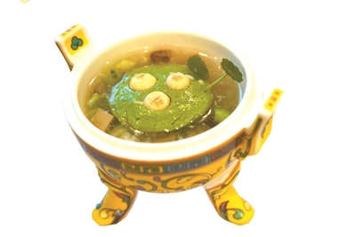 荷塘春月色則以魚肉、蓮子、蛋白、火腿等做出荷塘月色的意境,此菜既突出粵菜“清鮮嫩滑”的特點(diǎn),更形象顯露出粵菜“優(yōu)雅脫俗”的風(fēng)格;“荔熟秋蟬鳴”取嶺南佳果元素,何物令得“一騎紅塵妃子笑”?原是荔枝也!粵菜師傅巧妙運(yùn)用雞胸肉蓉做荔枝來(lái)比喻“果”,五花肉切片包卷荔浦芋來(lái)比作“蔬”,突出廣東地區(qū)果蔬物產(chǎn)豐富的創(chuàng)作思維;廣東屬沿海地區(qū),蝦本是居民餐桌常見之物,而姜?jiǎng)t是粵菜烹飪之引物,“無(wú)菜不落姜”已為粵菜師傅的烹調(diào)手法,“金絲伴彩霞”運(yùn)用多種烹飪法,采用一蝦兩食配以炸姜絲突出粵菜風(fēng)味。