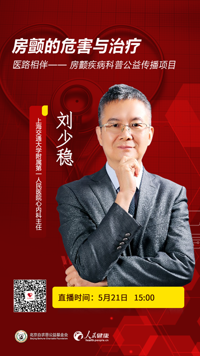 5月21日星期五15:00-16:00,我們將邀請上海交通大學(xué)附屬第一人民醫(yī)院心內(nèi)科主任劉少穩(wěn)做客演播室,為大眾普及房顫的危害與治療相關(guān)科普知識,千萬不要錯過。