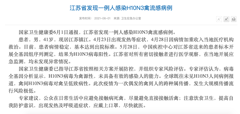 國家衛(wèi)健委:江蘇省發(fā)現(xiàn)一例人感染H10N3禽流感病例