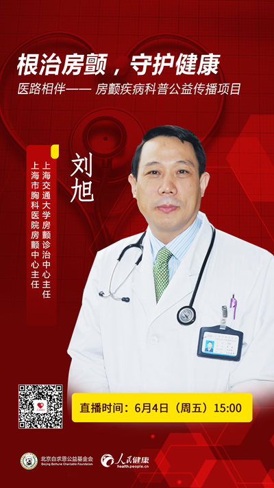 6月4日(周五)15:00-16:00,人民日報社旗下新媒體“人民好醫(yī)生”客戶端將邀請上海交通大學(xué)房顫診治中心主任劉旭做客直播間,就治療房顫的手段以及治療效果等問題進行科普直播,歡迎收看。