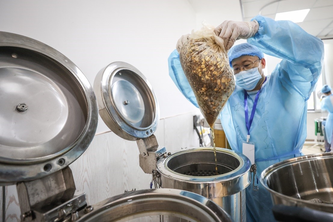 2021年5月23日,醫(yī)生在營口市中西醫(yī)結(jié)合醫(yī)院內(nèi)向自動煎藥機內(nèi)添加藥包。新華社記者 潘昱龍攝
