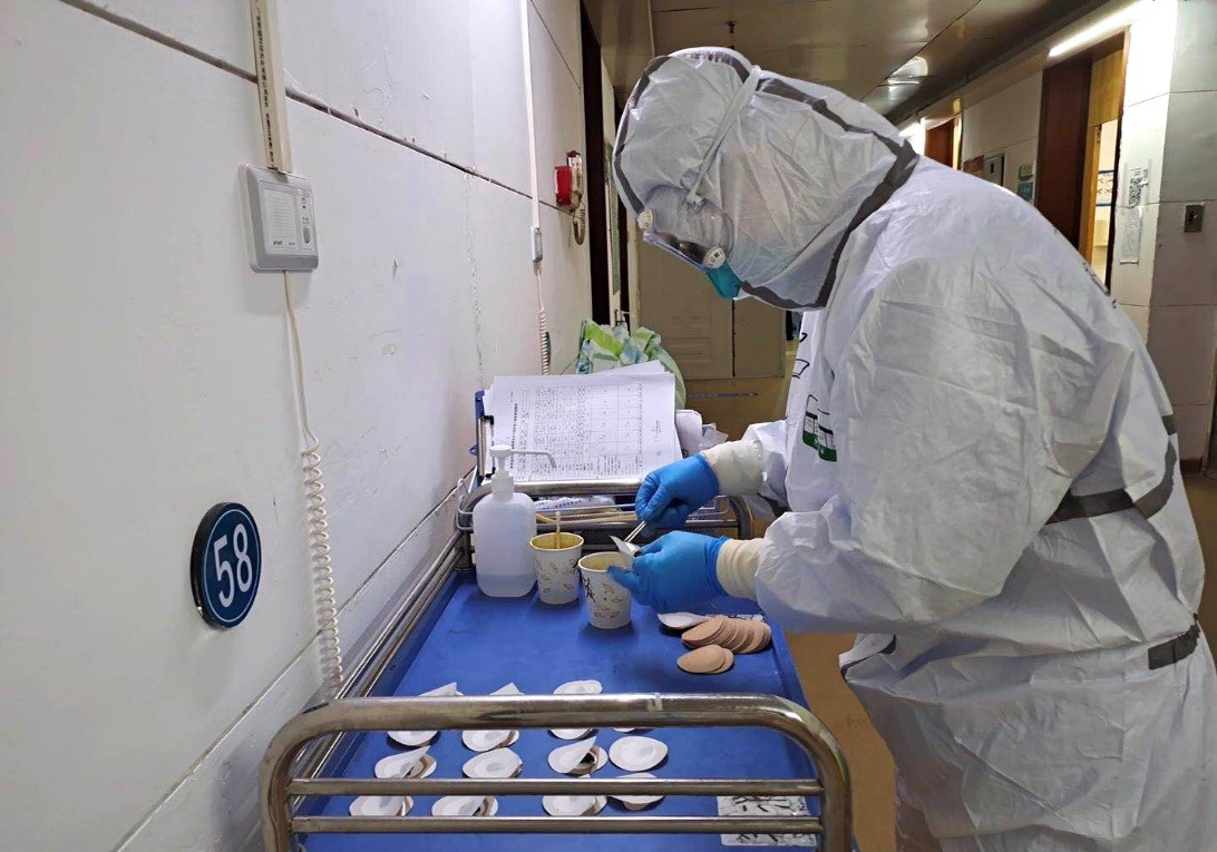 2020年2月11日,廣東省中醫(yī)院醫(yī)療隊隊員在為患者進行中藥穴位敷貼做準(zhǔn)備工作。新華社發(fā)(廣東省中醫(yī)院援助湖北醫(yī)療隊供圖)