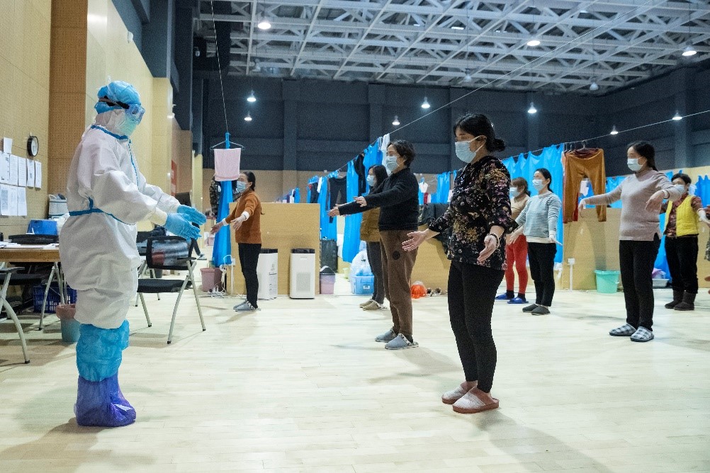 2020年2月25日,在江夏方艙醫(yī)院,湖南中醫(yī)藥大學(xué)第一附屬醫(yī)院醫(yī)護(hù)人員帶領(lǐng)新冠肺炎患者習(xí)練八段錦。新華社記者 沈伯韓攝