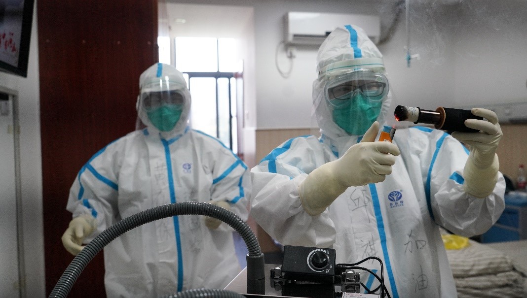 2020年2月18日,在江西中醫(yī)藥大學(xué)附屬醫(yī)院隔離病房,醫(yī)護(hù)人員運(yùn)用熱敏灸療法為患者治療。新華社記者 胡晨歡攝