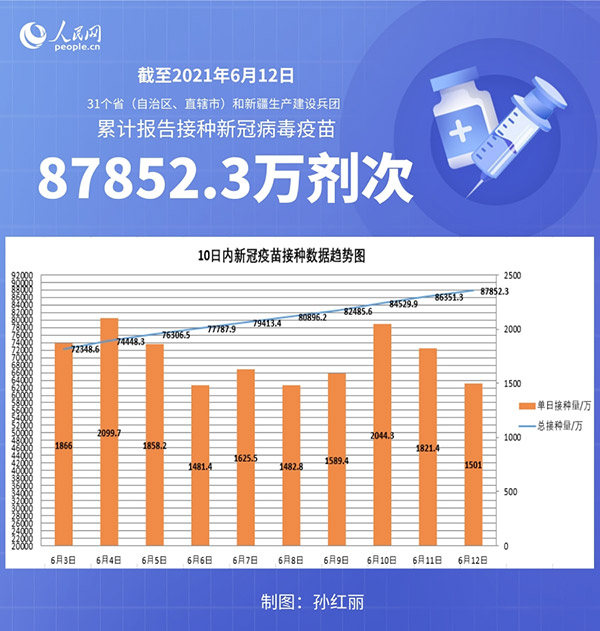 人民網(wǎng)北京6月13日電 (記者孫紅麗)據(jù)國家衛(wèi)生健康委官網(wǎng)消息,截至2021年6月12日,31個。ㄗ灾螀^(qū)、直轄市)和新疆生產(chǎn)建設(shè)兵團(tuán)累計報告接種新冠病毒疫苗87852.3萬劑次。