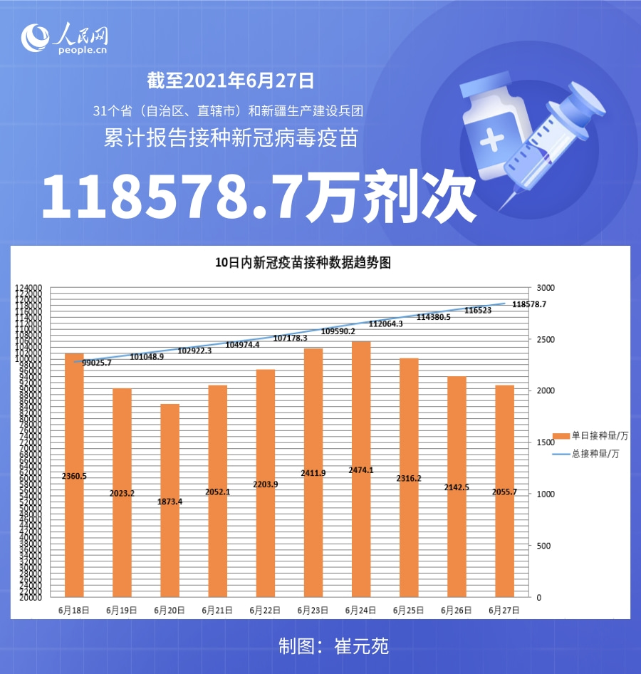 國(guó)家衛(wèi)健委:截至6月27日全國(guó)累計(jì)接種新冠病毒疫苗118578.7萬(wàn)劑次