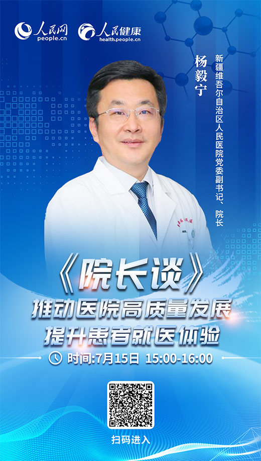 7月15日15:00-16:00,《院長談》專欄將邀請新疆維吾爾自治區(qū)人民醫(yī)院黨委副書記、院長楊毅寧做客演播室,就“推動醫(yī)院高質量發(fā)展 提升患者就醫(yī)體驗”話題與網友在線交流。