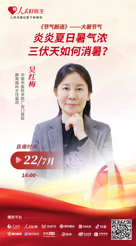7月22日14:00我們將邀請(qǐng)到中國中醫(yī)科學(xué)院廣安門醫(yī)院脾胃病科主任醫(yī)師吳紅梅做客演播室,為大家講解大暑節(jié)氣養(yǎng)生知識(shí),千萬不要錯(cuò)過。