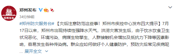 人民網(wǎng)北京7月21日電 (記者孫紅麗)據(jù)鄭州市委宣傳部官方微博消息,7月17日以來,鄭州市出現(xiàn)持續(xù)性強(qiáng)降水天氣,洪澇災(zāi)害發(fā)生后,由于飲水飲食衛(wèi)生狀況惡化、環(huán)境污染、病媒生物孳生、人群接觸機(jī)會增加及抵抗力下降等因素影響,容易發(fā)生各種傳染病。對此,鄭州市疾控中心提醒市民,要注意做好這四件事: