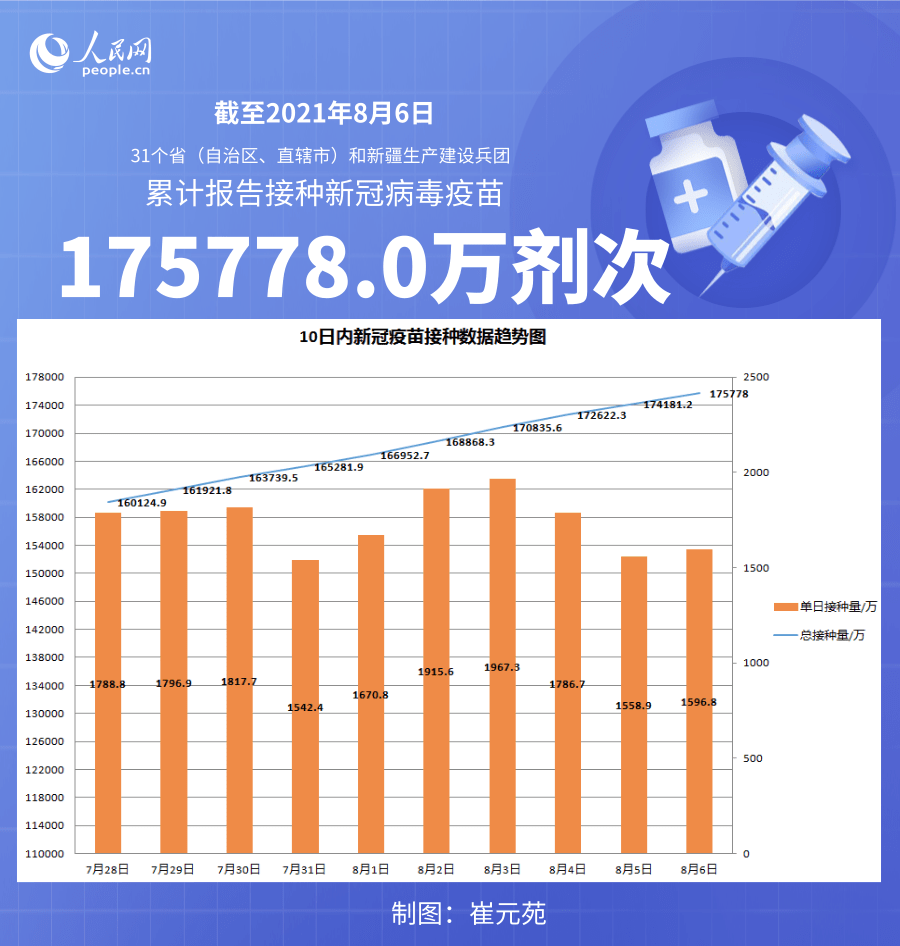 人民網(wǎng)北京8月7日電 (記者崔元苑)據(jù)國家衛(wèi)生健康委官網(wǎng)消息,截至2021年8月6日,31個。ㄗ灾螀^(qū)、直轄市)和新疆生產(chǎn)建設(shè)兵團累計報告接種新冠病毒疫苗175778.0萬劑次。