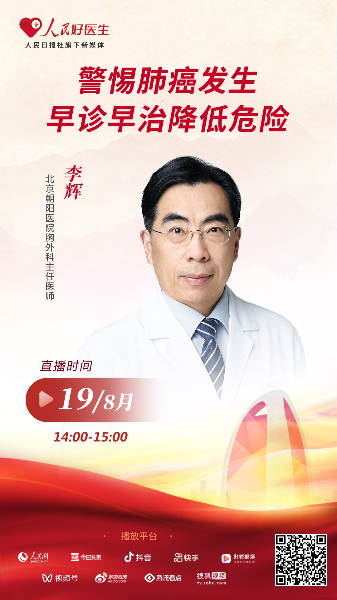 8月19日14:00-15:00,“人民好醫(yī)生”客戶端將邀請北京朝陽醫(yī)院胸外科主任醫(yī)師李輝,就肺部健康的相關(guān)內(nèi)容進行科普直播,歡迎大家收看!