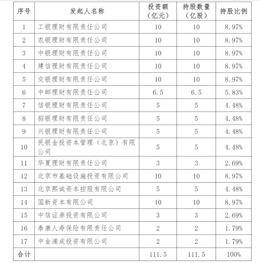 根據(jù)公告,國民養(yǎng)老保險(xiǎn)公司發(fā)起人分別為,工銀理財(cái)、農(nóng)銀理財(cái)、中銀理財(cái)、建信理財(cái)、交銀理財(cái)各投資10億元,持股比例均為8.97%;中郵理財(cái)投資6.5億元,持股比例5.83%;信銀理財(cái)、招銀理財(cái)、興銀理財(cái)、民銀金投資本管理(北京)有限公司各投資5億元,持股比例同為4.48%;華夏理財(cái)投資3億元、持股2.69%;北京市基礎(chǔ)設(shè)施投資有限公司投資10億元,持股8.97%;北京熙誠資本控股有限公司出資5億元,持股4.48%;國新資本出資10億元,持股8.97%;中信證券投資有限公司出資3億元,持股2.69%;泰康人壽投資2億元,持股1.79%;中金浦成投資有限公司出資2億元,持股1.79%。