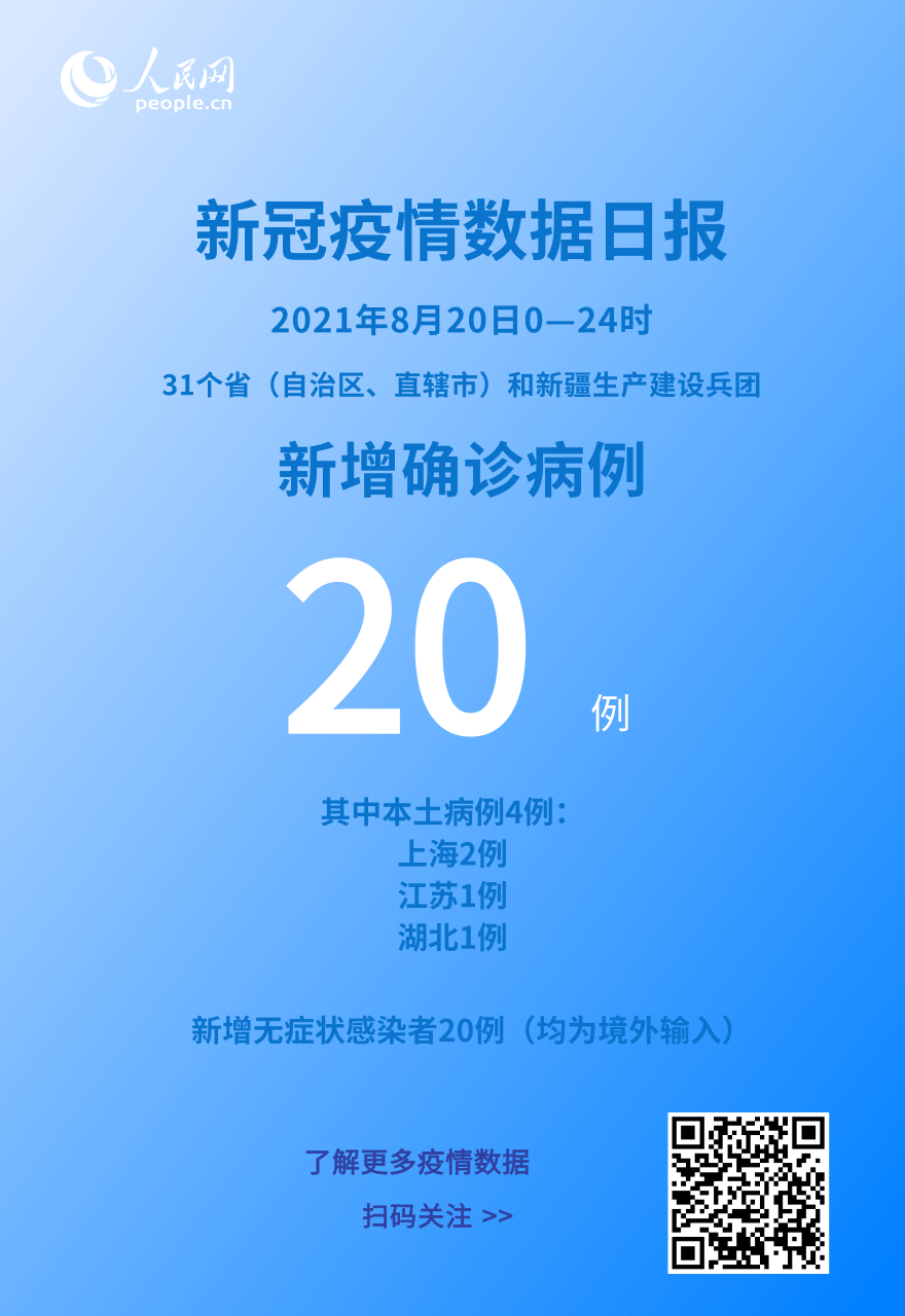 人民網(wǎng)北京8月21日電 (記者崔元苑)今日,國家衛(wèi)生健康委于官網(wǎng)發(fā)布了截至8月20日24時(shí)新型冠狀病毒肺炎疫情最新情況。8月20日0—24時(shí),31個(gè)。ㄗ灾螀^(qū)、直轄市)和新疆生產(chǎn)建設(shè)兵團(tuán)報(bào)告新增確診病例20例,其中境外輸入病例16例(廣東4例,云南3例,北京2例,上海2例,浙江2例,天津1例,內(nèi)蒙古1例,福建1例),本土病例4例(上海2例,江蘇1例,湖北1例);無新增死亡病例;無新增疑似病例。