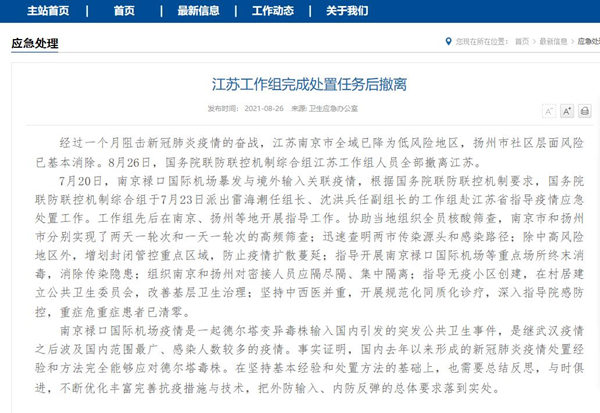 人民網(wǎng)北京8月26日電 (記者張文婷)據(jù)國家衛(wèi)健委官網(wǎng)消息,經(jīng)過一個月阻擊新冠肺炎疫情的奮戰(zhàn),江蘇南京市全域已降為低風(fēng)險地區(qū),揚(yáng)州市社區(qū)層面風(fēng)險已基本消除。8月26日,國務(wù)院聯(lián)防聯(lián)控機(jī)制綜合組江蘇工作組人員全部撤離江蘇。