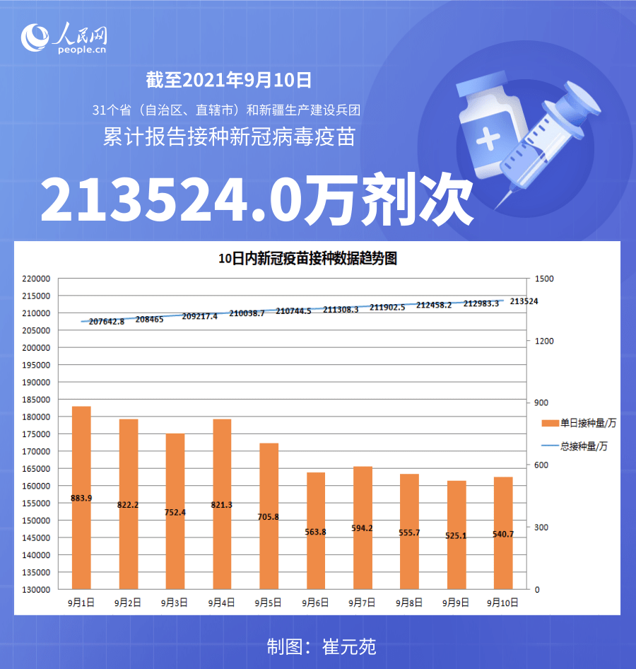 人民網(wǎng)北京9月11日電 (記者崔元苑)據(jù)國家衛(wèi)生健康委官網(wǎng)消息,截至2021年9月10日,31個。ㄗ灾螀^(qū)、直轄市)和新疆生產(chǎn)建設(shè)兵團累計報告接種新冠病毒疫苗213524.0萬劑次。