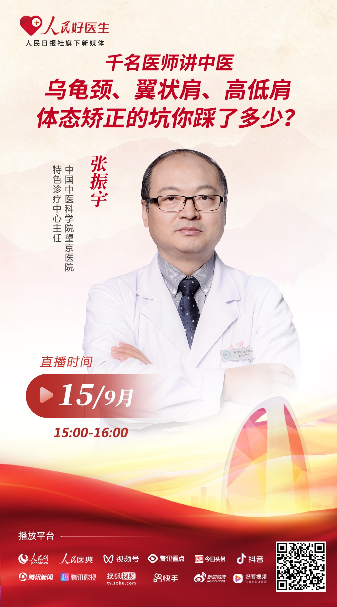 9月15日15:00-16:00,人民日報社旗下新媒體平臺“人民好醫(yī)生”與國家中醫(yī)藥管理局辦公室聯(lián)合推出的“千名醫(yī)師講中醫(yī)”系列直播將邀請中國中醫(yī)科學院望京醫(yī)院特色診療中心主任張振宇做客直播間,為大眾詳細科普體態(tài)矯正的正確做法。