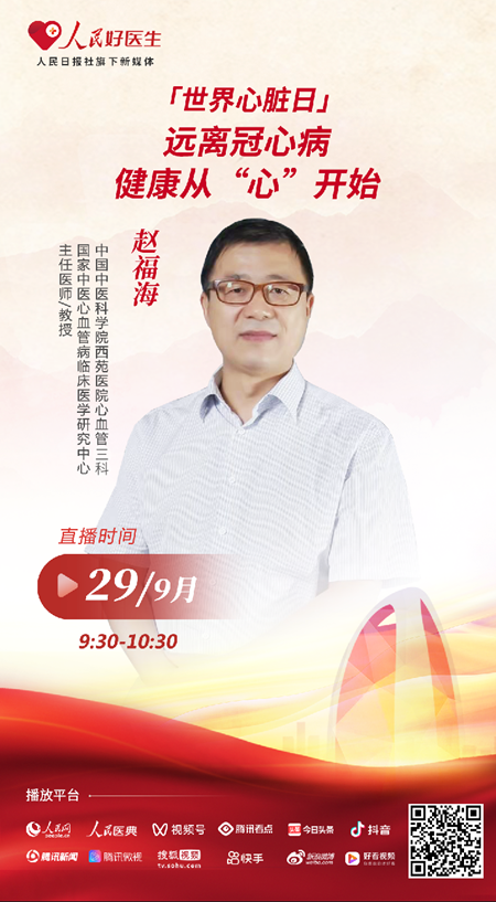 9月29日9:30至10:30,中國中醫(yī)科學院西苑醫(yī)院心血管三科/國家中醫(yī)心血管病臨床醫(yī)學研究中心、主任醫(yī)師/教授、中國醫(yī)師協(xié)會中西醫(yī)結合心臟介入委員會副主任委員趙福海將做客“人民好醫(yī)生”APP直播間,為大家分享冠心病相關知識,屆時敬請收看。