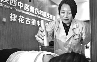 陜西省商洛市棣花古鎮(zhèn)中醫(yī)診所艾灸師何丹玲在為患者調(diào)理頸椎。新華社發(fā)