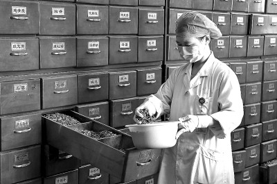 鄭州市中醫(yī)院的藥師在煎藥中心內(nèi)配藥。新華社發(fā)