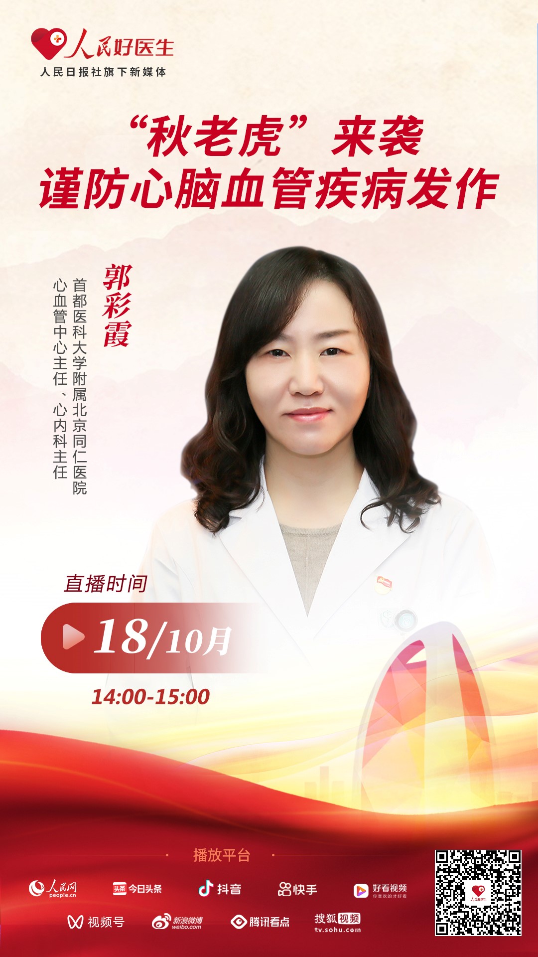 “秋老虎”是指立秋后短時間的天氣回?zé)岈F(xiàn)象,氣溫波動較大,心血管疾病患者病情容易出現(xiàn)反復(fù)、甚至加重。10月18日14:00-15:00,人民日報社旗下新媒體平臺“人民好醫(yī)生”將邀請首都醫(yī)科大學(xué)附屬北京同仁醫(yī)院心血管中心主任、心內(nèi)科主任,主任醫(yī)師郭彩霞做客直播間,與大家分享心腦血管方面疾病及相關(guān)預(yù)防、治療科普知識。
