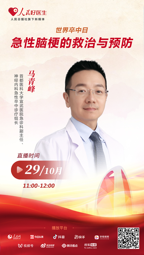 10月29日11:00-12:00,人民日報社旗下新媒體平臺“人民好醫(yī)生”APP直播間邀請到首都醫(yī)科大學(xué)宣武醫(yī)院神經(jīng)內(nèi)科急性卒中診療組長馬青峰,為大家分享急性腦卒中的診治與預(yù)防。歡迎屆時收看。