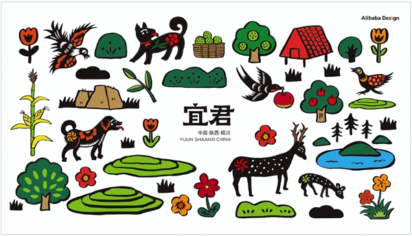 提煉出農(nóng)民畫中的元素,并用農(nóng)民畫的手法繪制了宜君物產(chǎn)和代表風景,組成宜君的畫面。