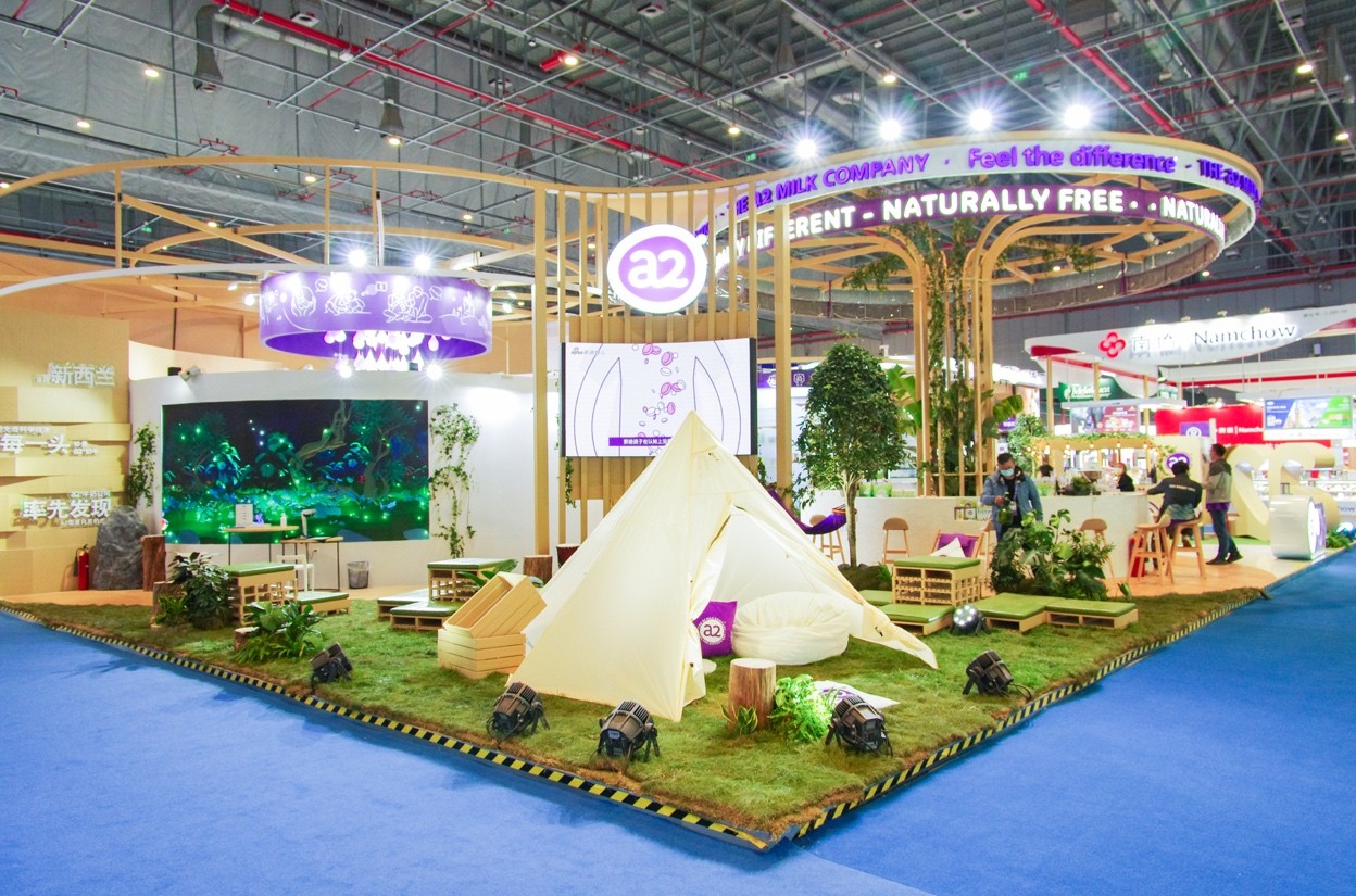 黎笑介紹,本屆a2牛奶公司展臺布置以新西蘭南島的純凈大自然為主要設計理念,標志的紫色基調,不僅展示了a2牛奶的產品,也將新西蘭代表性的文化符號帶到整個展區(qū),讓參觀者感受到新西蘭的優(yōu)質環(huán)境以及天然牧場的自然風光。
