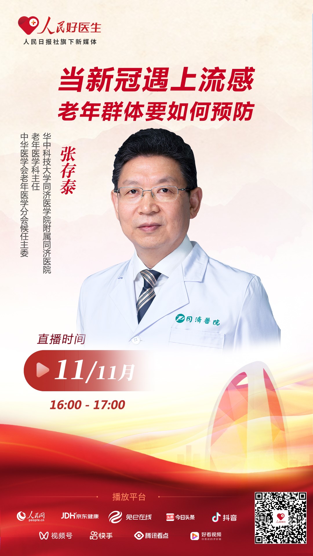 11月11日16:00,華中科技大學(xué)同濟(jì)醫(yī)學(xué)院附屬同濟(jì)醫(yī)院老年醫(yī)學(xué)科主任張存泰做客人民好醫(yī)生客戶端,為網(wǎng)友科普老年群體應(yīng)如何預(yù)防流感等相關(guān)話題,歡迎屆時收看。