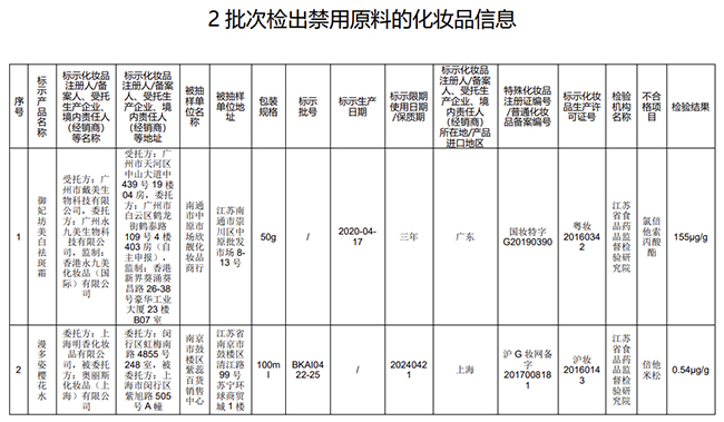 人民網(wǎng)北京11月12日電 (記者孫紅麗)據(jù)國(guó)家藥監(jiān)局官網(wǎng)消息,國(guó)家藥監(jiān)局近日發(fā)布通告,標(biāo)示為委托方廣州永九美生物科技有限公司、受托方廣州市戴美生物科技有限公司生產(chǎn)的御妃坊美白祛斑霜,標(biāo)示為委托方上海明香化妝品有限公司、受托方奧麗斯化妝品(上海)有限公司生產(chǎn)的漫多姿櫻花水,檢出《化妝品安全技術(shù)規(guī)范(2015年版)》中規(guī)定的禁用原料。