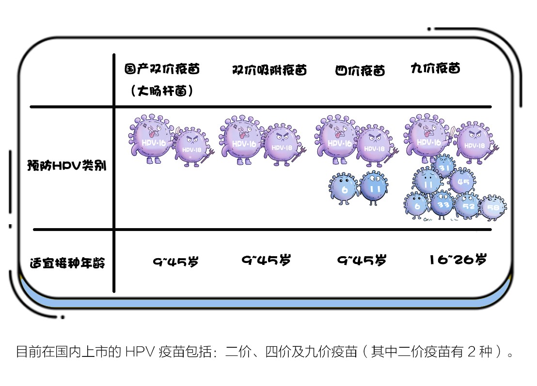 專家介紹,接種HPV疫苗可以預(yù)防約70%—90%的宮頸癌。目前,在國(guó)內(nèi)上市的HPV疫苗包括二價(jià)、四價(jià)及九價(jià)疫苗。二價(jià)疫苗針對(duì)HPV-16和18兩種高危型別;四價(jià)疫苗在這兩者基礎(chǔ)上,增加了HPV-6和11兩個(gè)低危型別;九價(jià)疫苗則在四價(jià)疫苗基礎(chǔ)上多加了5種高危型別HPV,分別是HPV-31、33、45、52、58。四價(jià)和九價(jià)疫苗適用于9-45歲女性,但九價(jià)疫苗僅適用于16-26歲女性。