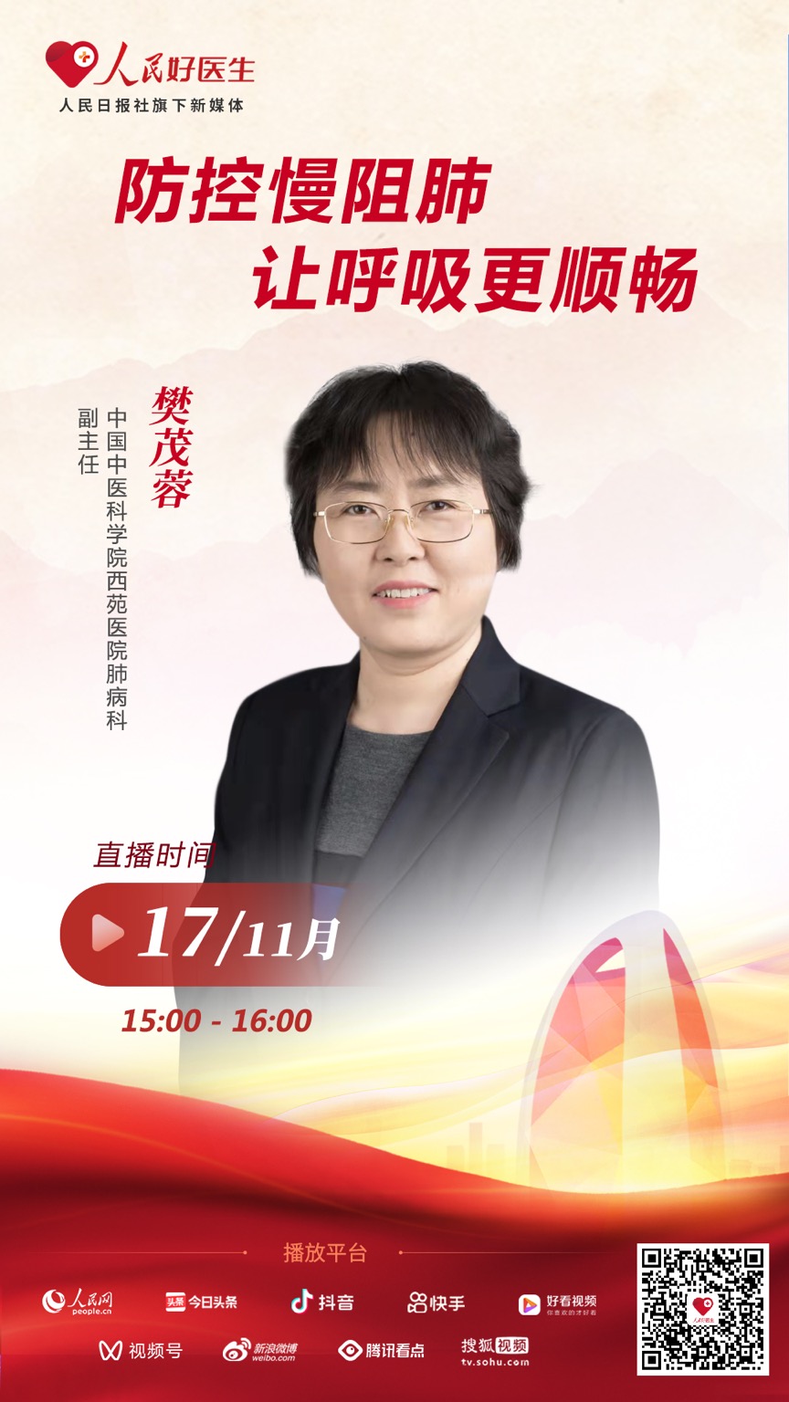 11月17日15:00-16:00,人民日?qǐng)?bào)社旗下新媒體平臺(tái)“人民好醫(yī)生”將邀請(qǐng)中國(guó)中醫(yī)科學(xué)院西苑醫(yī)院肺病科副主任樊茂蓉做客直播間,為大家詳細(xì)科普慢阻肺疾病的防控知識(shí),千萬(wàn)不要錯(cuò)過(guò)。