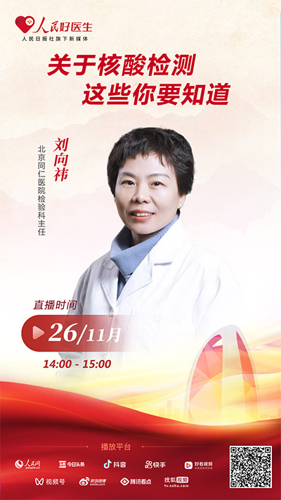 11月26日14:00,“人民好醫(yī)生”客戶端將邀請北京同仁醫(yī)院檢驗科主任劉向祎進行視頻直播,為您科普新冠核酸檢測的相關知識,千萬不要錯過。