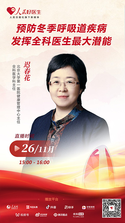 11月26日15:00,人民日報社旗下新媒體客戶端“人民好醫(yī)生”將邀請中華醫(yī)學會全科醫(yī)學分會主任委員、北京大學第一醫(yī)院全科醫(yī)學科主任遲春花做客直播間,為大家?guī)矶竞粑兰膊☆A防的相關(guān)內(nèi)容,歡迎大家收看!