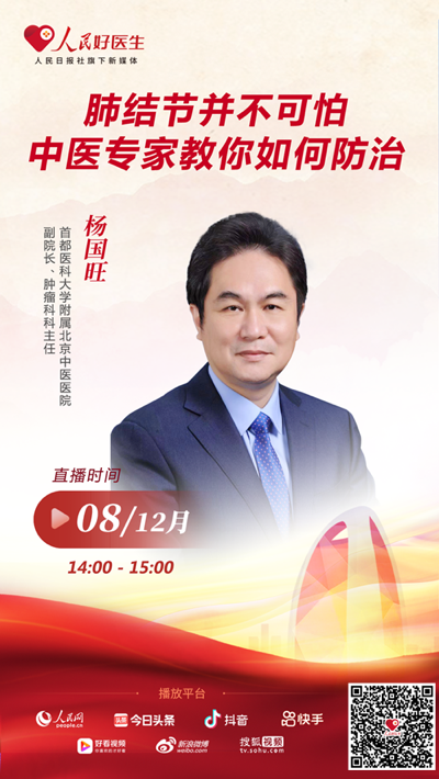 12月8日14:00,首都醫(yī)科大學(xué)附屬北京中醫(yī)醫(yī)院副院長、腫瘤科科主任楊國旺將做客人民日報(bào)社旗下新媒體平臺(tái)“人民好醫(yī)生”客戶端直播間,與大家分享“肺結(jié)節(jié)防治”的相關(guān)知識(shí)。歡迎屆時(shí)收看。