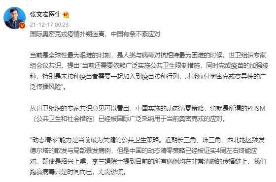 人民網(wǎng)北京12月17日電 (記者喬業(yè)瓊)12月17日凌晨,復旦大學附屬華山醫(yī)院感染科主任張文宏在其微博上表示,國際奧密克戎疫情撲朔迷離,中國有條不紊應對。