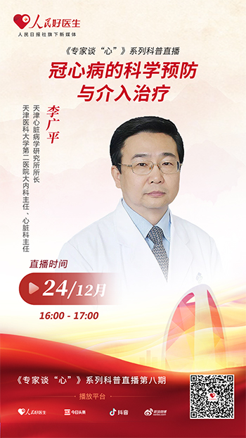 12月24日16:00,“人民好醫(yī)生”客戶端將邀請?zhí)旖蛐呐K病學(xué)研究所所長、天津醫(yī)科大學(xué)第二醫(yī)院大內(nèi)科主任李廣平進(jìn)行視頻直播,給大家科普冠心病診治的相關(guān)知識,千萬不要錯過。