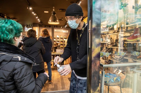 2021年12月22日,在法國北部城市里爾,商店店員為顧客提供消毒洗手液。(新華社發(fā))