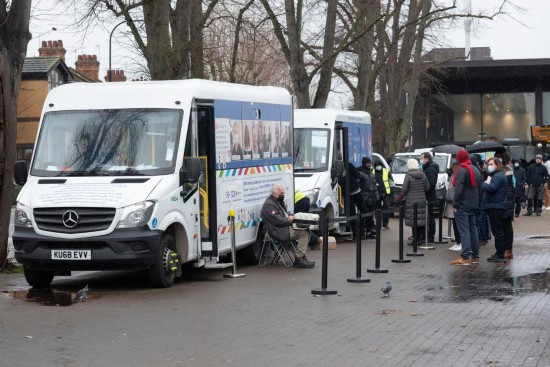2021年12月6日,在英國倫敦,人們在新冠疫苗接種車旁排隊(duì)等待。(新華社發(fā))