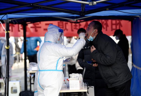 12月17日,市民在西安市碑林區(qū)柏樹林街道三學(xué)街社區(qū)核酸檢測點進(jìn)行核酸檢測。新華社記者 劉瀟 攝