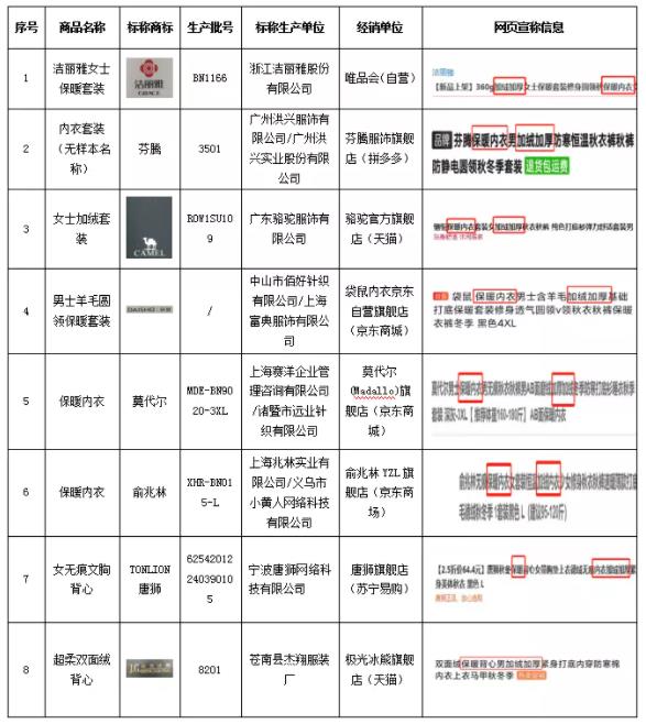 宣稱為“加絨”、“保暖內(nèi)衣”,但未執(zhí)行保暖內(nèi)衣標(biāo)準(zhǔn)的8款樣品信息。來源:天津市消協(xié)官方微信截圖